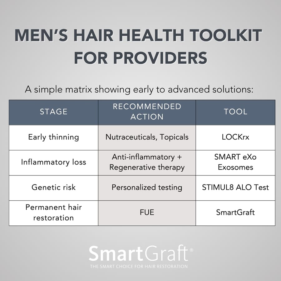 Providers can play a proactive role by initiating conversations around hair health as part of routine wellness assessments and by incorporating evidence-based therapies and diagnostics into health and wellness assessments. Smart Solutions RX provides a myriad of services to support medical professionals, including the LOCKrx Drug-Free Hair Support Program, SMART eXo exosomes, and SmartGraft FUE Automated hair restoration.