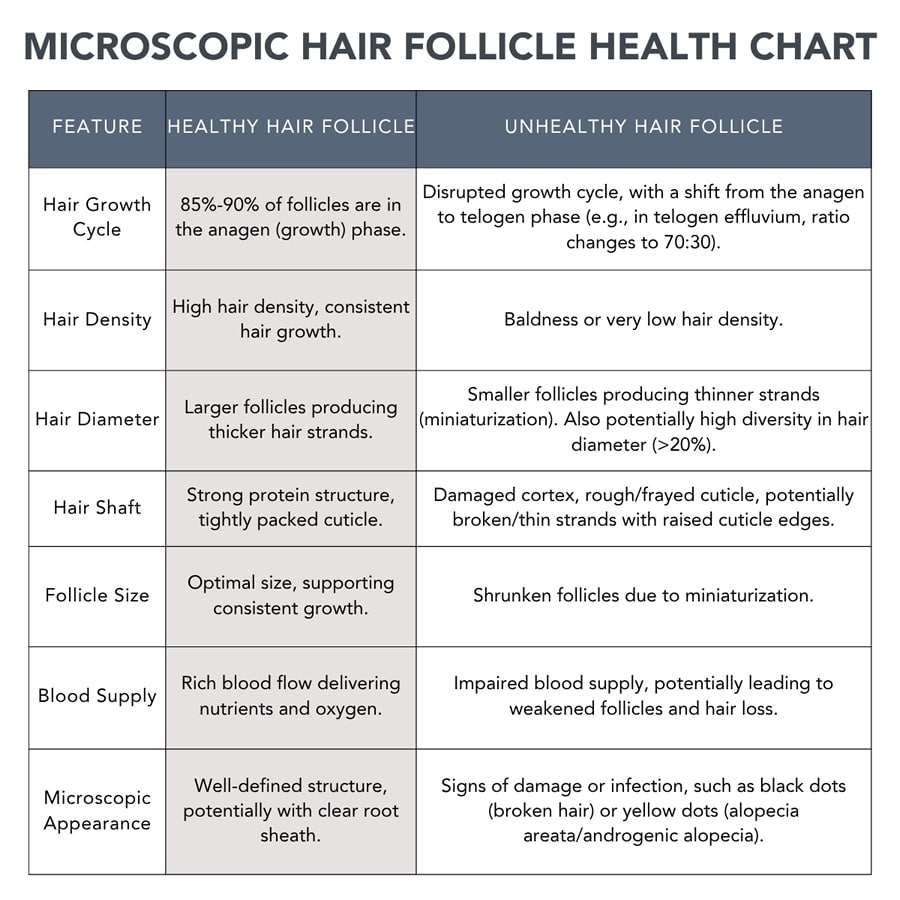 Healthy hair follicles go through a natural growth cycle: growing (anagen), resting (telogen), and shedding (catagen), producing thick, pigmented hair. In contrast, miniaturizing follicles, often triggered by hormonal imbalances (especially elevated DHT), inflammation, or poor circulation, shrink over time and produce thinner, shorter, and less pigmented hairs. This process, known as follicular miniaturization, is a hallmark of androgenic alopecia and other types of hair loss. Therapeutic interventions such as LOCKrx, SMART eXo exosomes, and SmartGraft aim to either halt or reverse this process by reducing inflammation, enhancing cellular communication, nourishing the follicle, and—when necessary—transplanting healthy follicles to restore natural density and function.