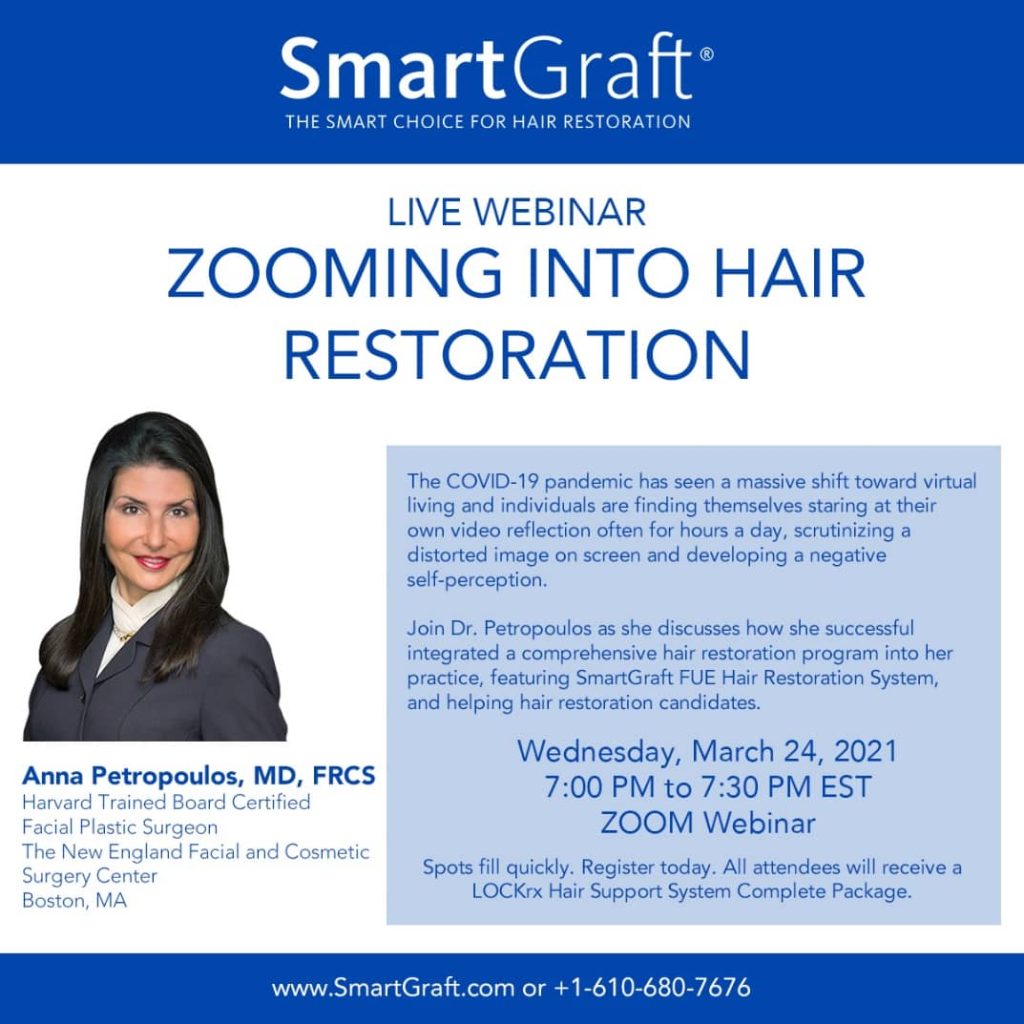 For physicians seeking to add hair restoration to their practice, finding a company that takes a global approach to hair loss is significant and ultimately determines the success of integration of hair restoration in one’s practice. As each individual case differs in the approach to treating hair loss, Vision Medical supports a multi-tiered approach to addressing hair loss concerns, from supplements to surgery, and is a GHLS recognized Select Technology as a company doing things right in the field of hair restoration. Join SmartGraft physician and LOCKrx Medical Advisory Board Members, Dr. Anna Petropoulos as she discusses zoom dysmorphia and the uprise in hair restoration consultations during the pandemic as well the successful integration of a comprehensive hair restoration program into her practice. Dr. Petropoulos will discuss clinical insight, provide tips and recommendations for overall market opportunities, and marketing ideal patient candidates. To register for the webinar, click here. Spaces fill quickly. Call today to register for one of the workshops in your area at +1-610-680-7676 or email us at RSVP@smartgraft.com – you can also register on the web by visiting our website www.SmartGraft.com and click on the Events page.